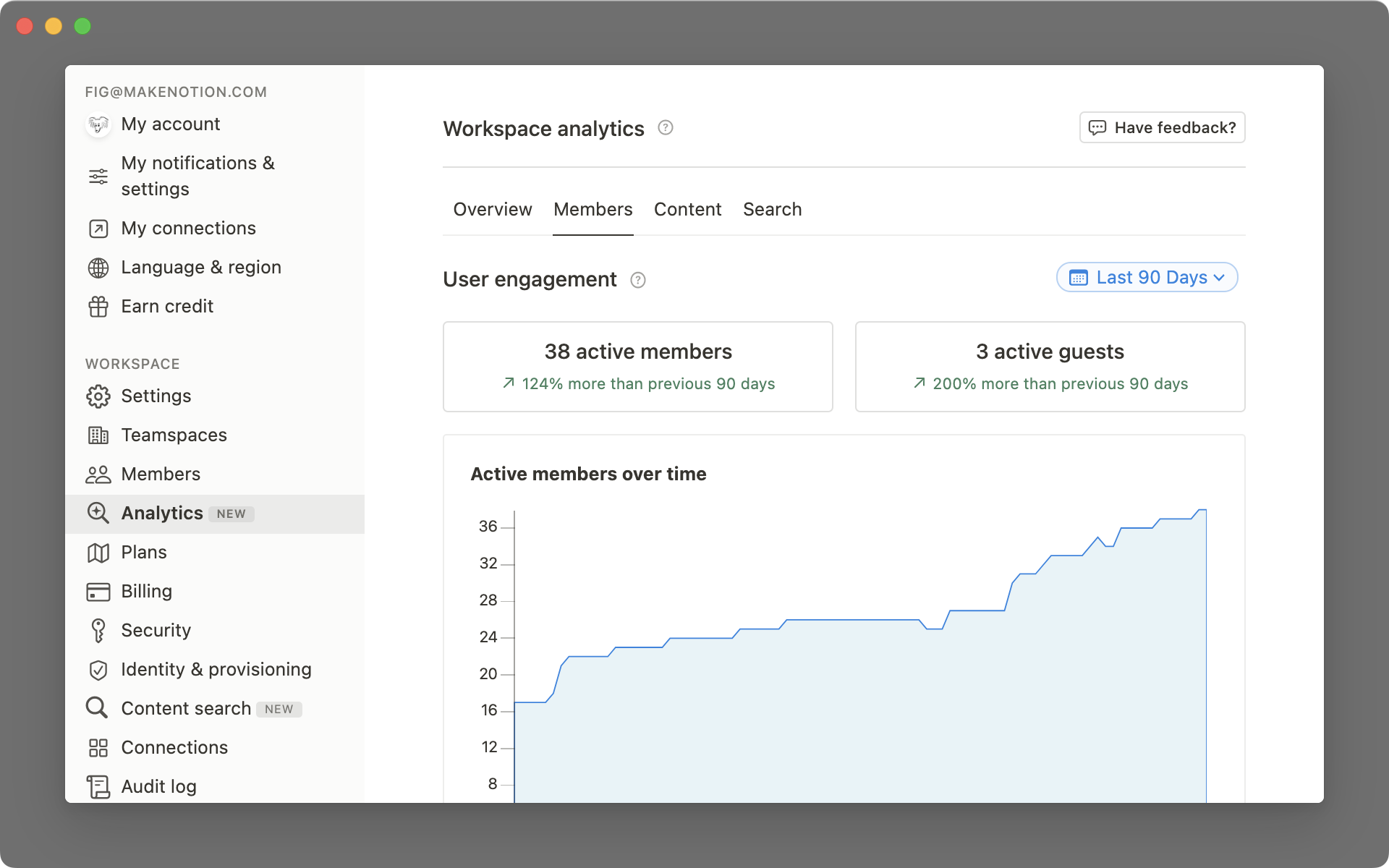 选择 成员、内容 或 搜索 选项卡以获取更详细的分析。如果你不是工作空间所有者,你将只能访问 内容。